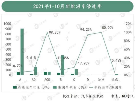 據(jù)汽車保險(xiǎn)數(shù)據(jù)顯示,目前整個(gè)乘用車市場以A、B、A0、C、A00級車為主。 以今年前十個(gè)月的銷量來看,這些主流級別車型中,新能源車滲透率最高的還是A00級車型,其他級別車型的電動(dòng)化替代空間基本都在90%以上。A級車作為乘用車市場體量最大的一部分,也是目前電動(dòng)化轉(zhuǎn)型壓力最大的一個(gè)市場。