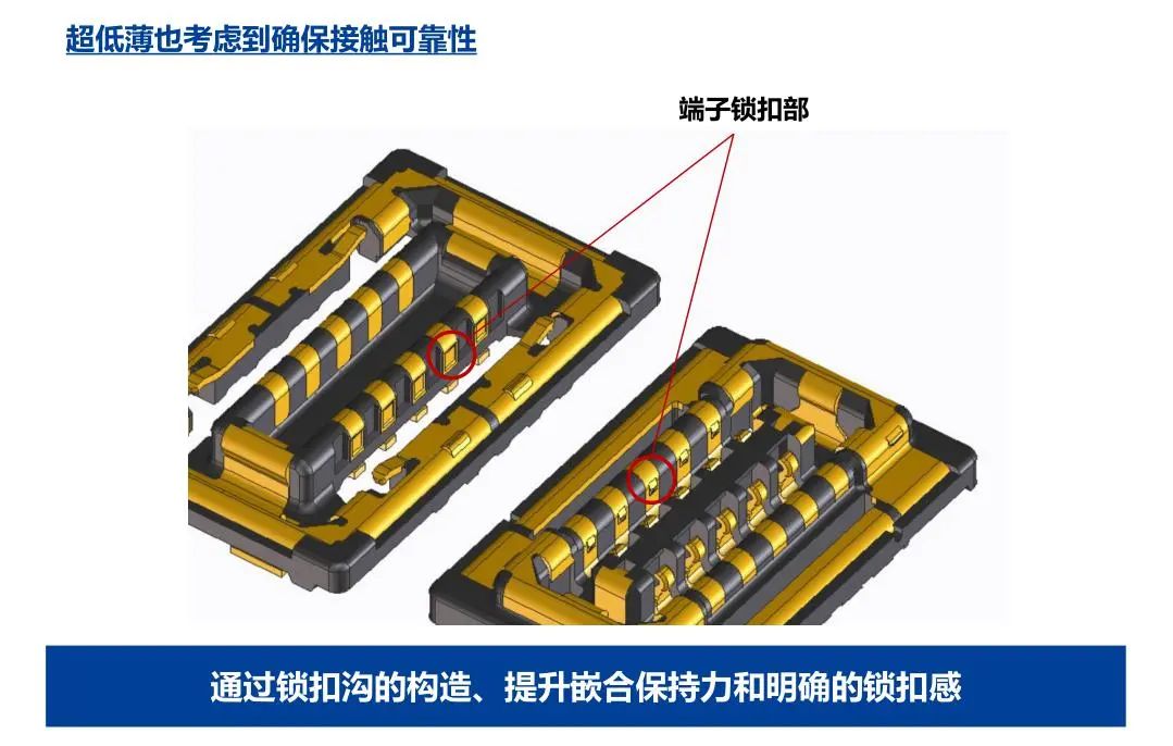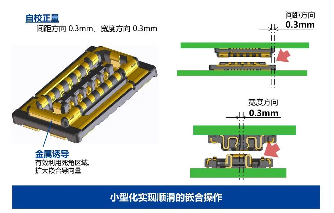 尺寸 省空間 防燥對策 RF特性(連接器單體) RF特性(連接器+FPC) 牢固構(gòu)造 端子鎖扣構(gòu)造 通過金屬誘導(dǎo)實現(xiàn)了較大的自校正量