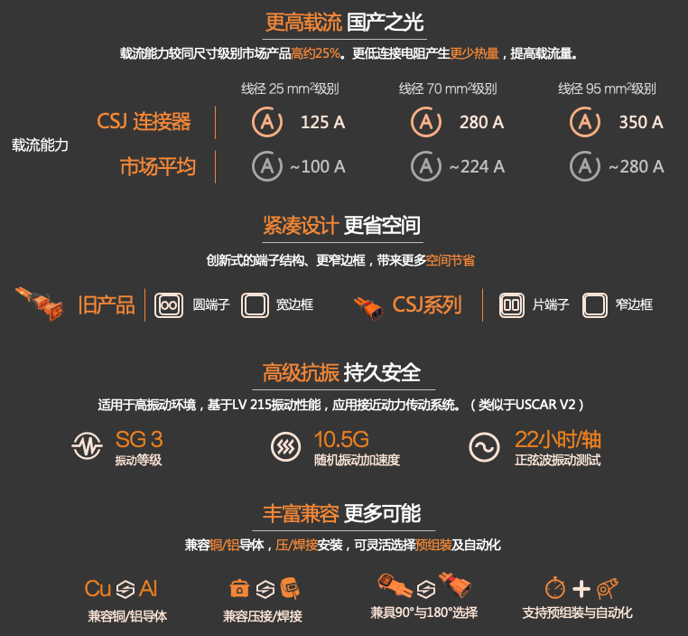 而對于中大型、大型電動汽車的主干道連接,CSJ2100則可以作為超大電流與功率傳輸?shù)淖吭侥芰?/span>